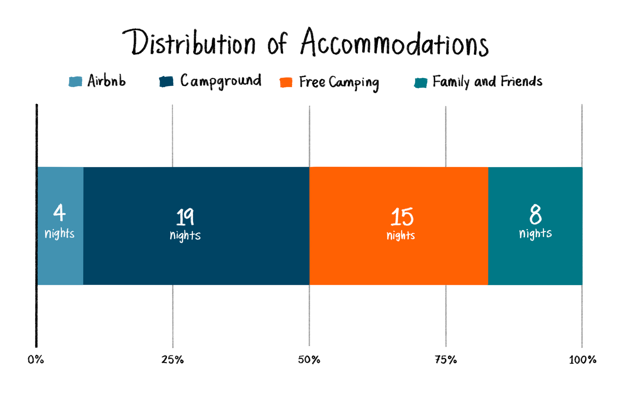 How were we able to keep our daily costs this low? While there are fixed costs like gas, there were other expenses we managed to avoid shelling out unnecessary amounts of money for. A couple factors that contributed greatly to our low daily average spending were our focus on the outdoors and our accommodation arrangements.